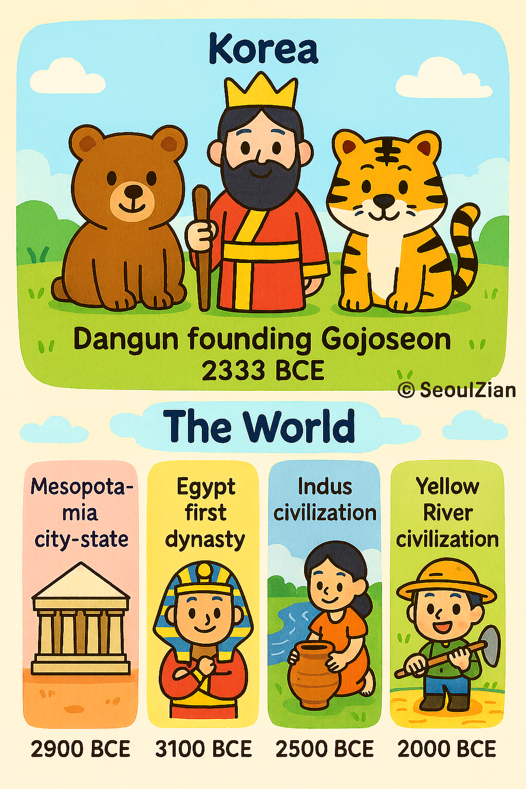 Thus, the founding myth of Gojoseon not only marks the beginning of Korean history but also aligns with the broader emergence of civilizations around the world.